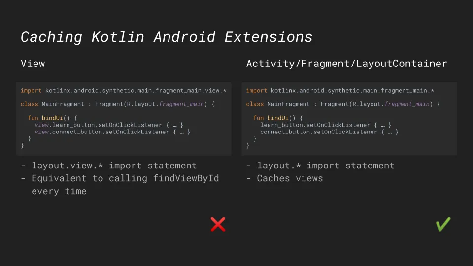 Views don’t cache the extension property. Using view.view_id is equivalent to calling findViewById every time and looking up the view over and over again. This is an easy mistake to make in fragments, where you can get the root view.