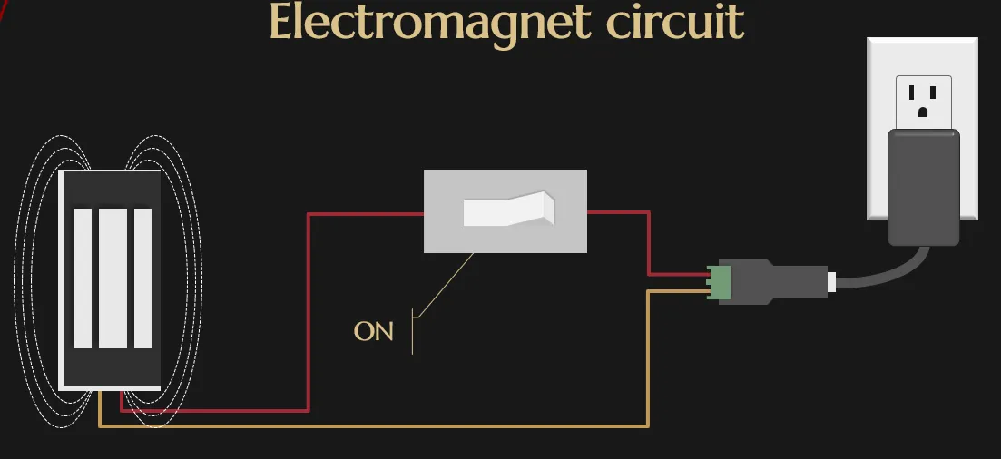 Our electromagnet circuit works the same way as the light bulb circuit. When the electromagnet is powered, instead of emitting light, it produces a magnetic field, and this would hold down the metal plate attached to the lid so the treasure chest cannot be opened.