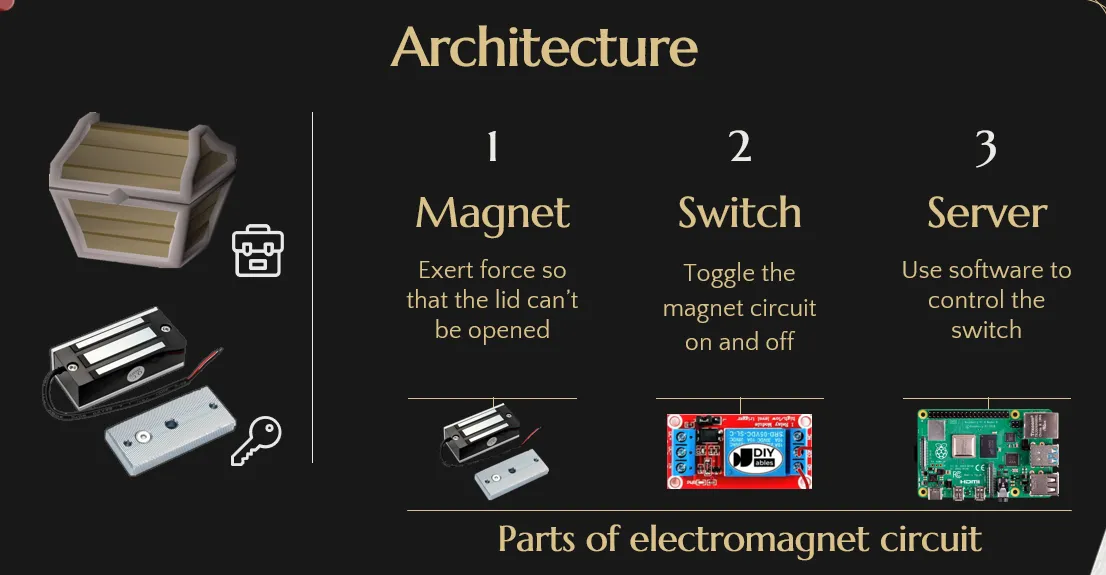 Now that we have this, if we send a POST request to our new server, what will happen is that it will turn the pin on, which turns the signal wire on, which controls the relay, which controls the electromagnet, which unlocks the treasure chest! (make each part progressive bigger text size)